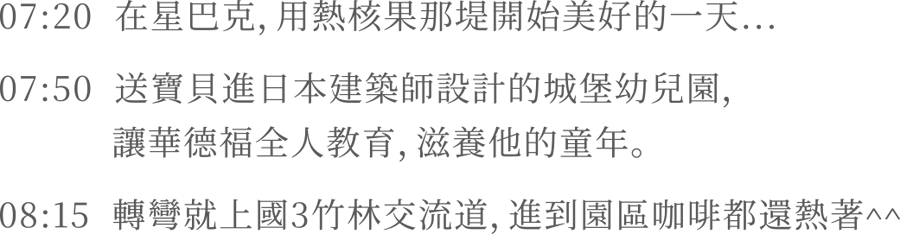 Debug或許需要加班,但孩子的童年不會等你…一條富林路,3分鐘速達國3竹林交流道,5分鐘接駁68快速道路,15分鐘直進竹科園區、高鐵特區。